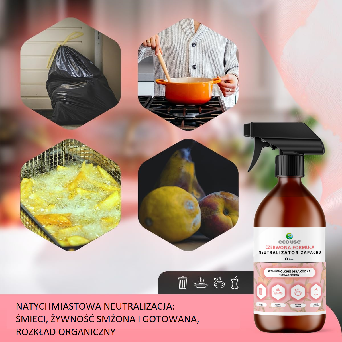 Wystarczy spryskać sprayem dotknięty obszar, aby je zneutralizować i stworzyć przyjemniejsze doznania zapachowe lub dodać do wody w proporcji 1:10 i umyć powierzchnię.