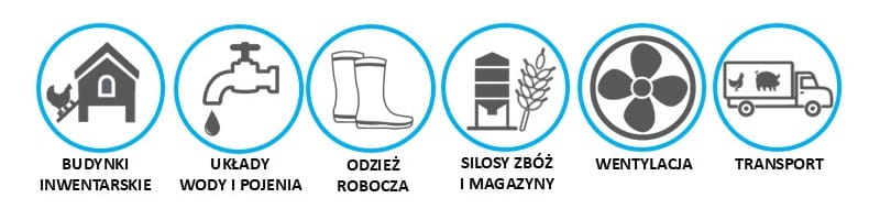 Dezynfekcja powierzchni ścian, podłóg, sprzętu inwentarskiego, odzieży, zbiorników, układów wody technologicznej, linii pojenia, wentylacji, transportu, magazynów, włącznie z takimi, które mają kontakt z żywnością.