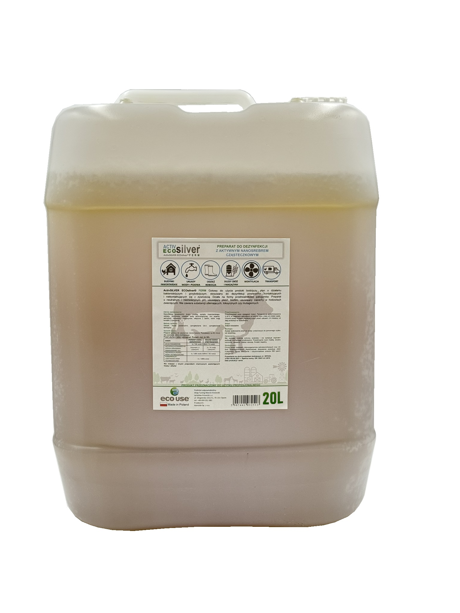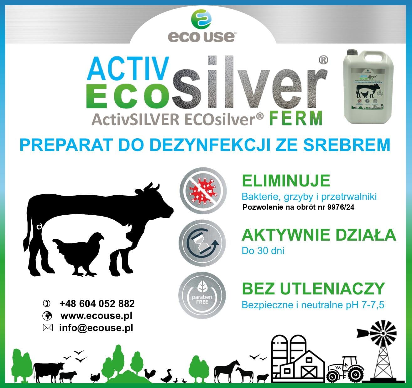 ActivSILVER ECOsilver® FERM Gotowy do użycia produkt biobójczy, płyn o działaniu bakteriobójczym i grzybobójczym. Działa na formy przetrwalnikowe patogenów. Preparat o neutralnym i nieinwazyjnym pH 7-7.5, usuwający pleśń, biofilm, zapachy w hodowlach zwierzęcych. Nie zawiera substancji utleniających, toksycznych czy mutagennych.